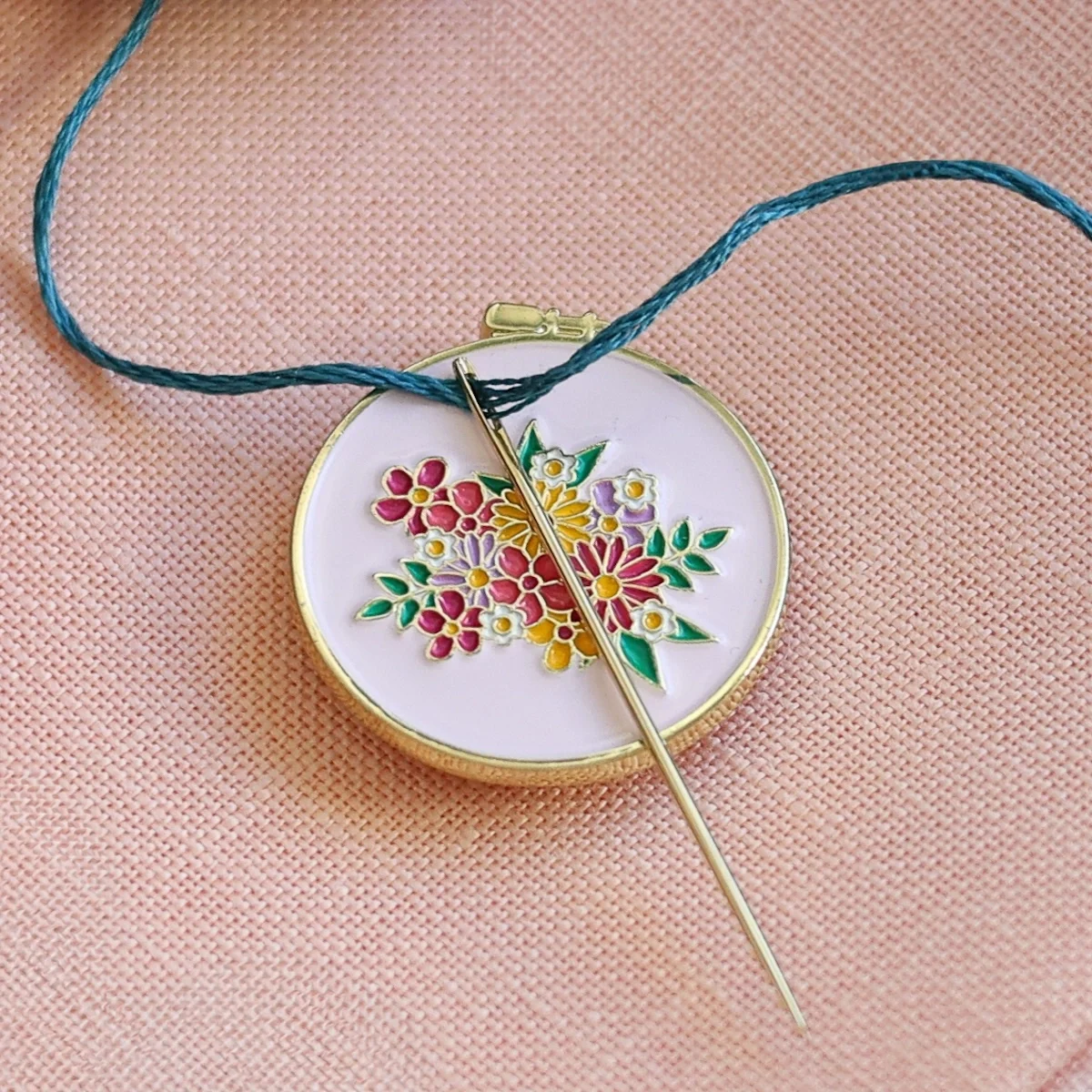 That’s what needle minders are for. It’s a small magnetic holder that attaches to the fabric and holds the needle. They’re super practical and super cute.