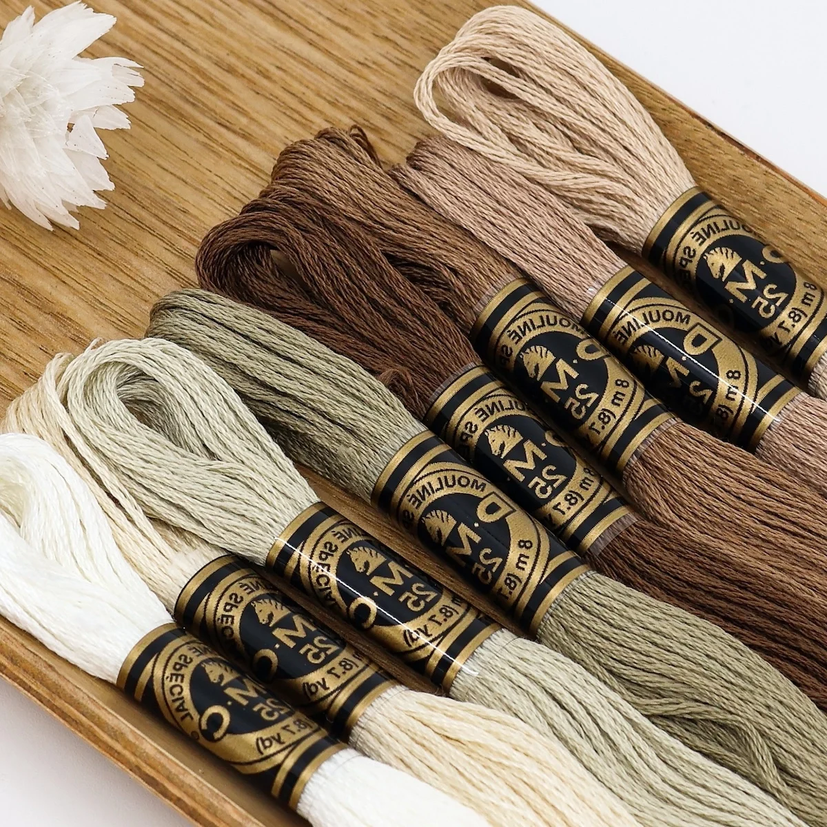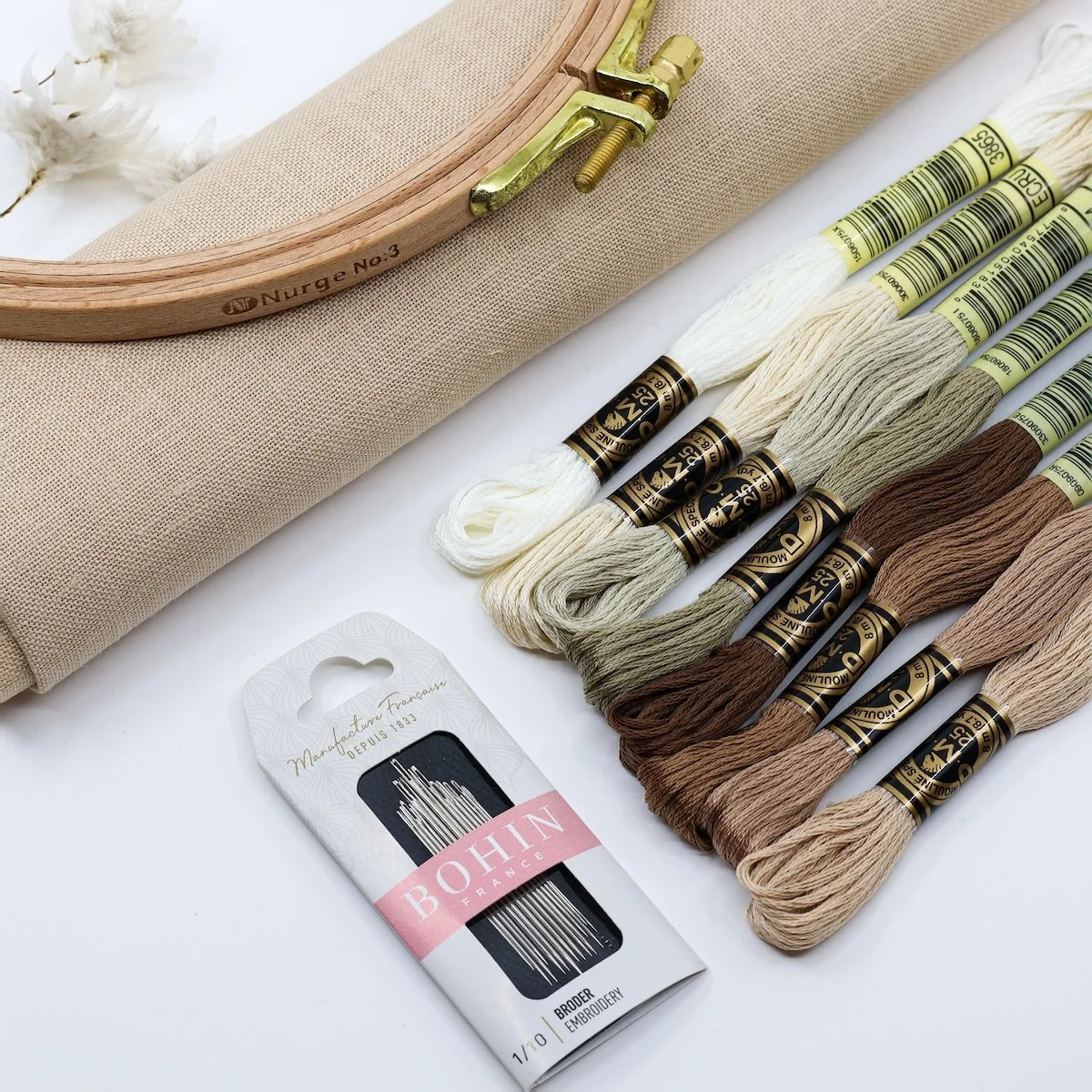 A linen cut-out in a color that perfectly matches the set of 8 skeins of DMC Mouliné Spécial;