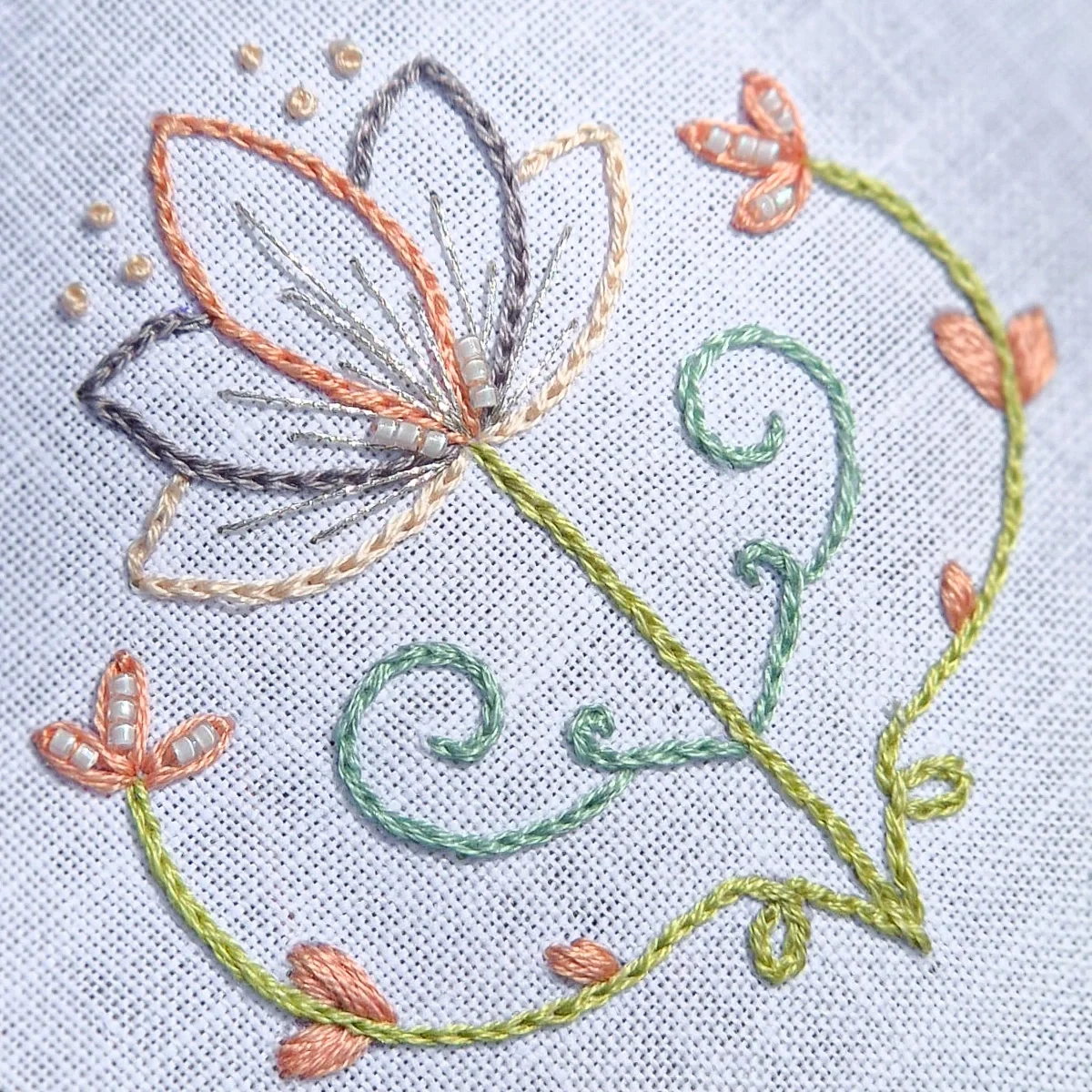 This is a soft palette that combines delicate greens, peach tones and light greys, balanced by a luminous cream – perfect for creating light, natural embroideries.
