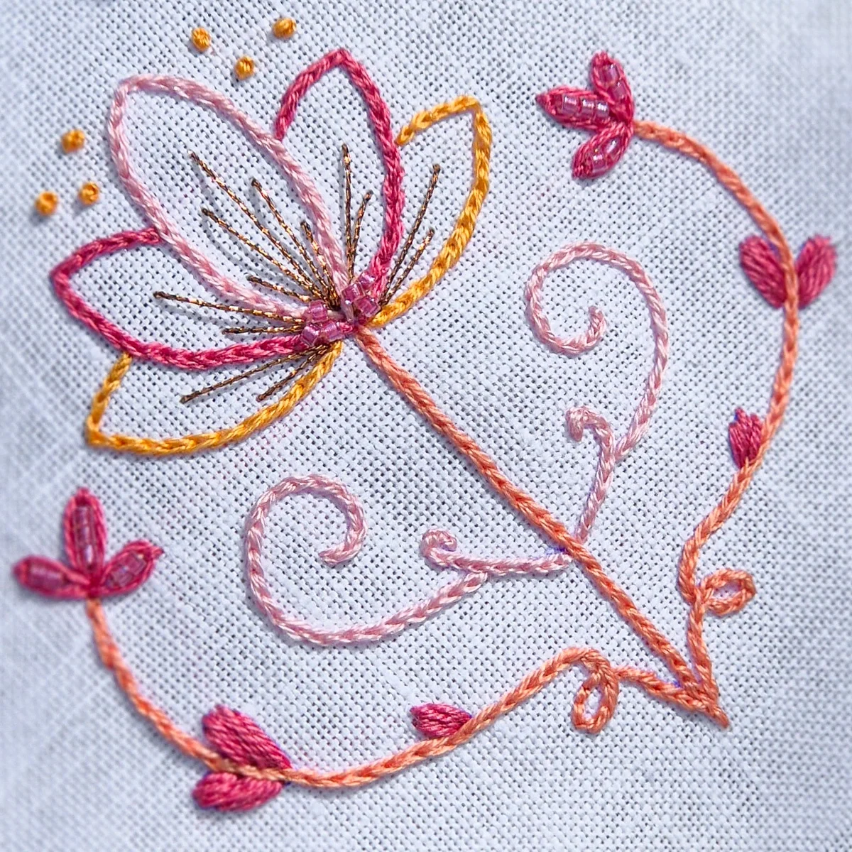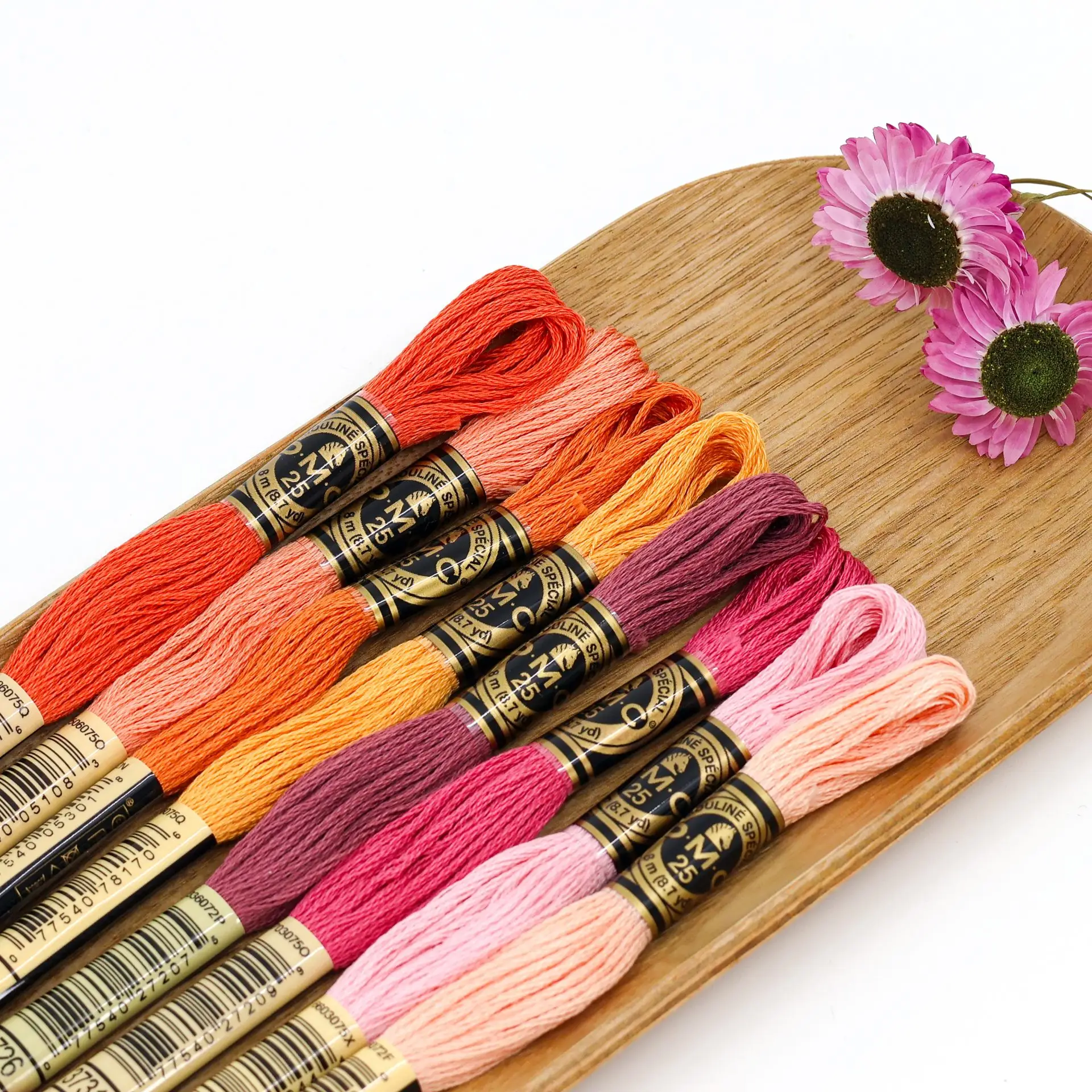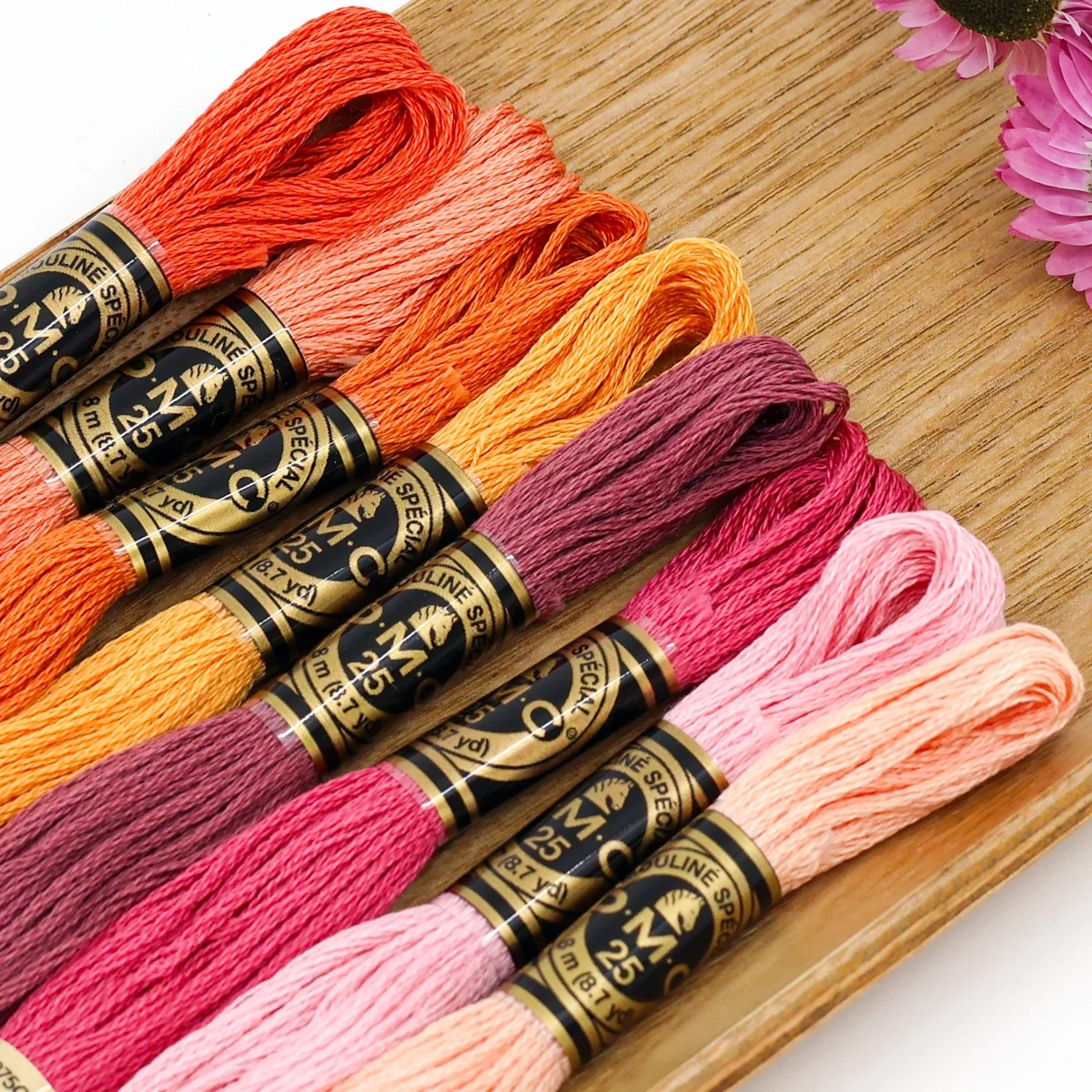 This selection brings together bright oranges, vibrant corals and warm pinks, balanced by a deep mauve – an energetic and cheerful palette, perfect for those who want to create embroideries full of life and contrast.