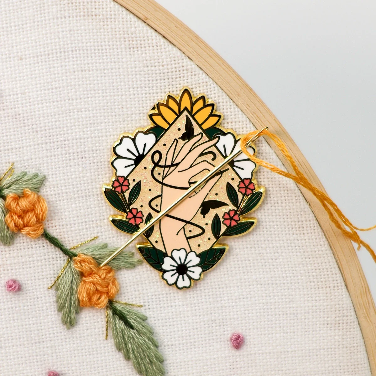We fell in love with this one from the small brand Stitchonomy. Is there a more embroidery-inspired design than a hand holding a needle?