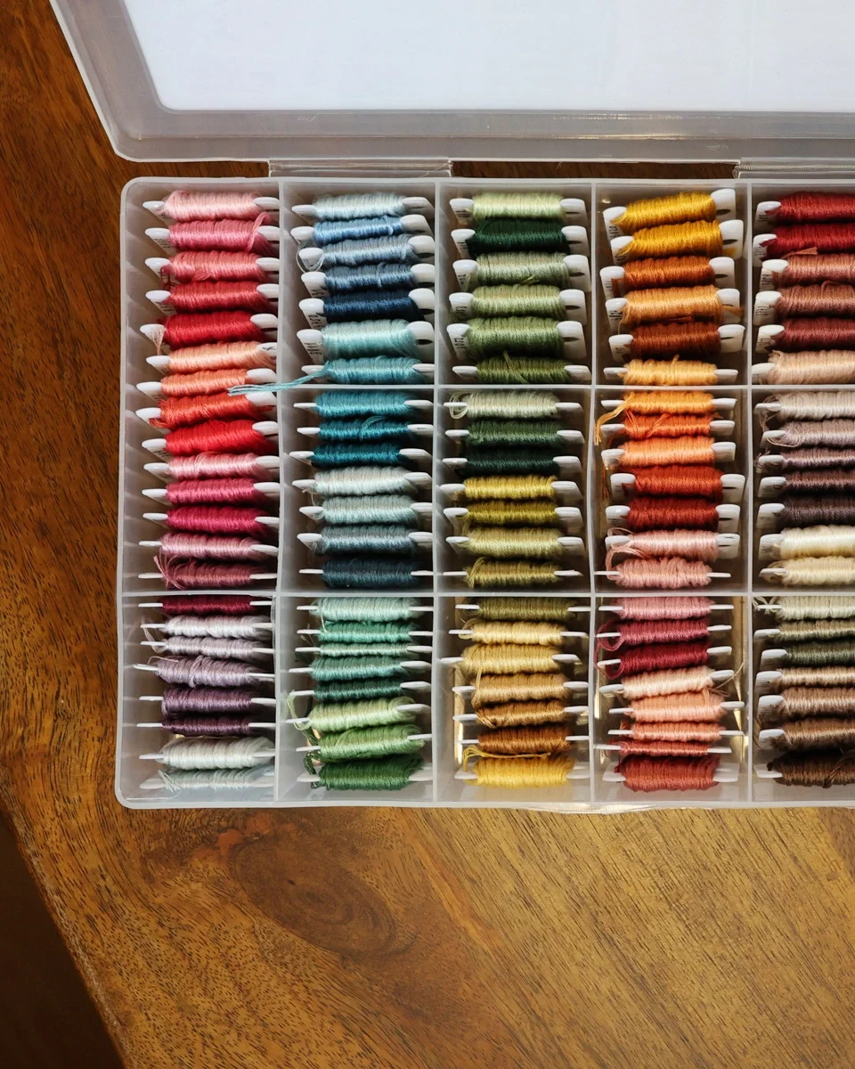 Todas temos em casa caixas e caixinhas onde guardamos miudezas (quem nunca reutilizou a famosa lata de biscoitos?). Mas no que toca a fios de bordar, não há nada mais satisfatório do que vê-los arrumados numa só caixa e prontos a serem usados. Principalmente no que toca à composição de paletas de cor, é essencial conseguires ver de relance o que tens, o que te falta e o que combina.