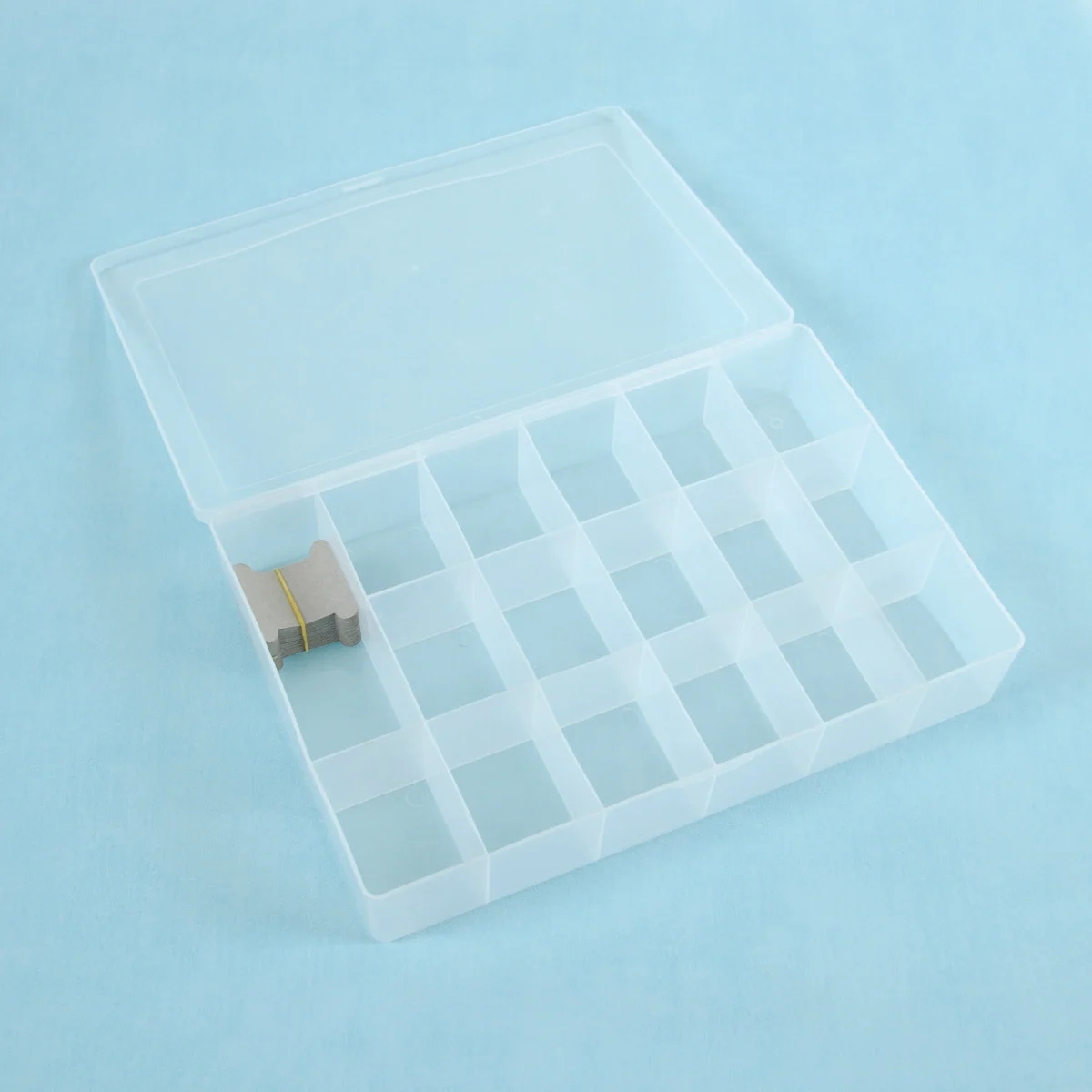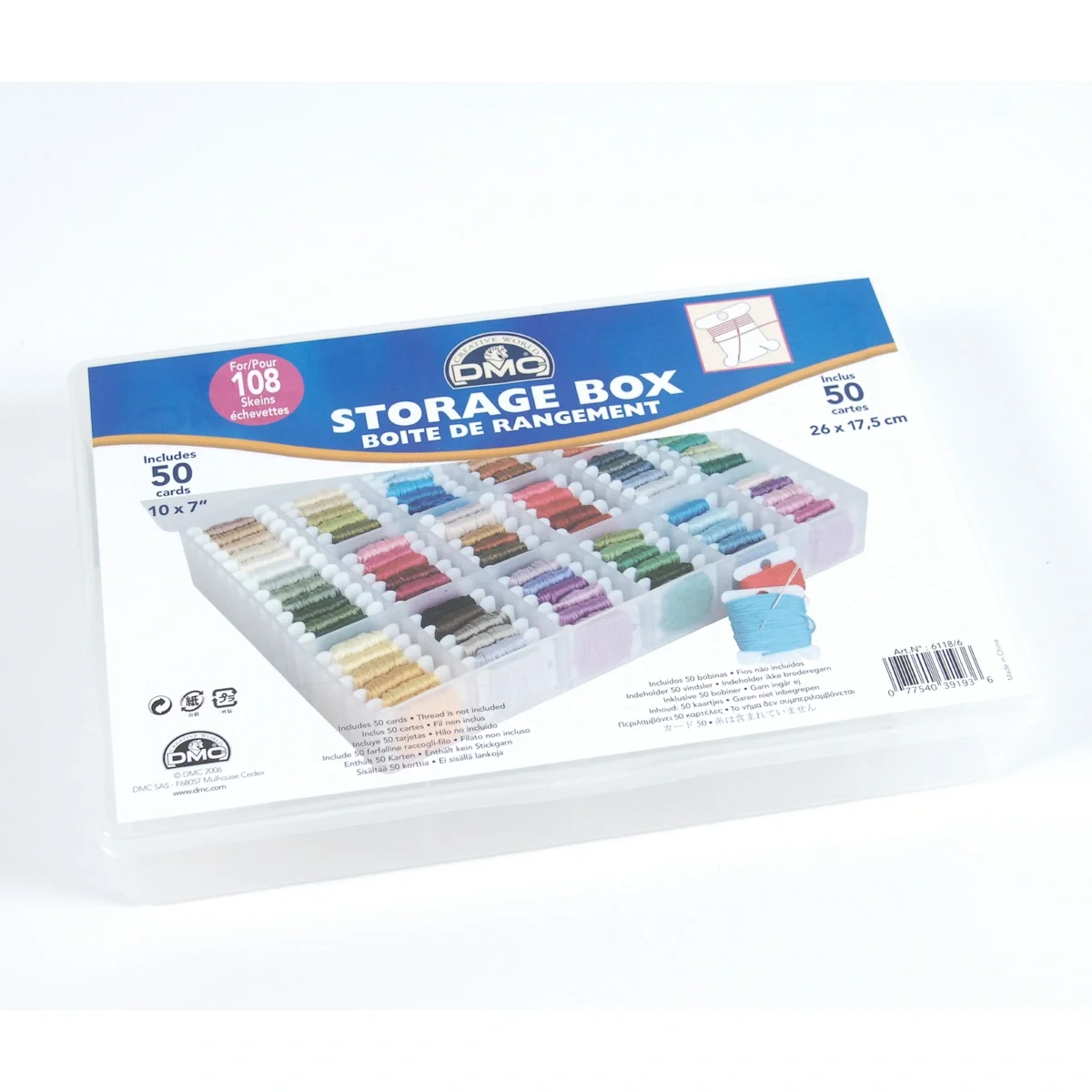 Caixa de plástico com capacidade para 108 bobines. Inclui 50 bobines de cartão para organização imediata dos teus fios.
