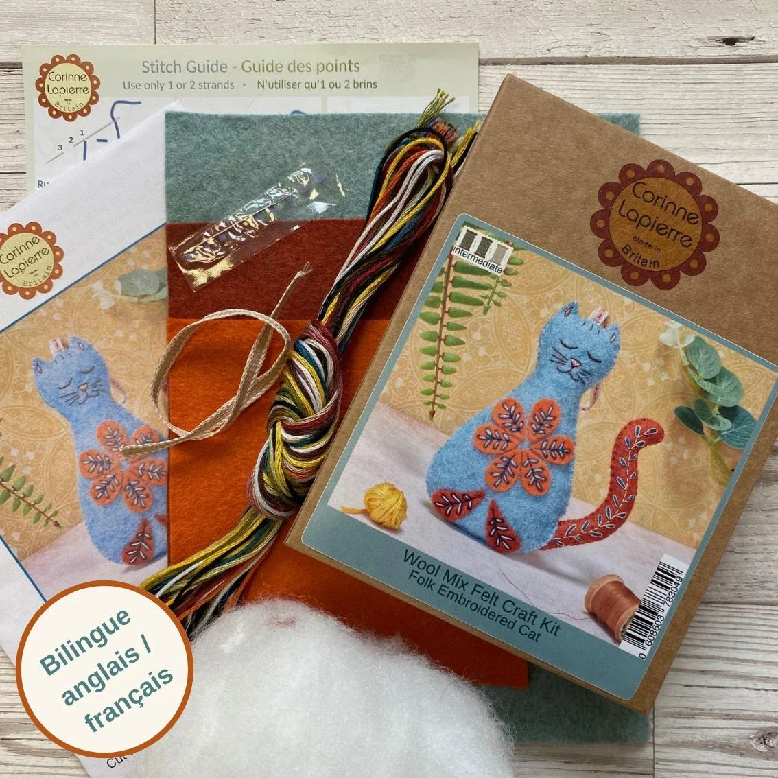 A marca anglo-francesa Corinne Lapierre desenvolveu este kit amoroso, num design folk, com o qual vais criar este gatinho azul, ideal para ofereceres ou decorares a tua casa.