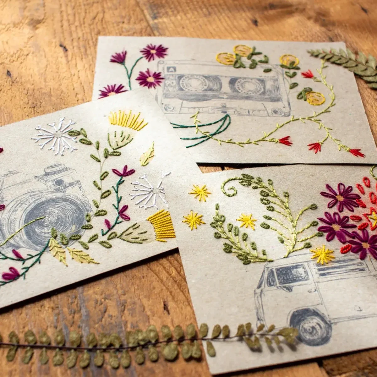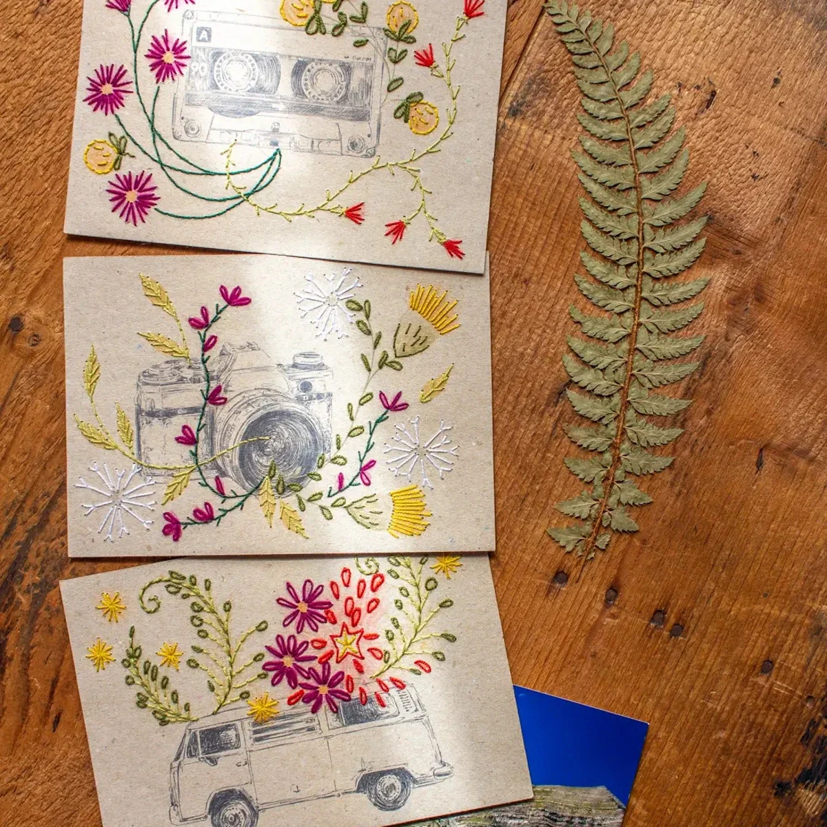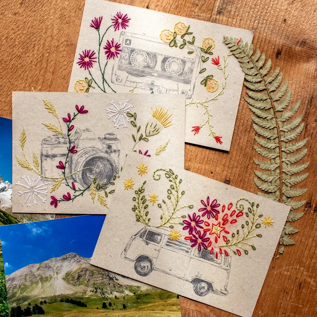 Foi a pensar nisso que decidi trazer-vos este kit de bordado em papel. Embalado num envelope semi-translúcido, inclui 3 cartões em papel tamanho postal (motivos: carrinha, máquina fotográfica, cassete), fios de bordar, uma agulha e instruções simples em inglês, com acesso a um e-book com instruções mais detalhadas em francês.