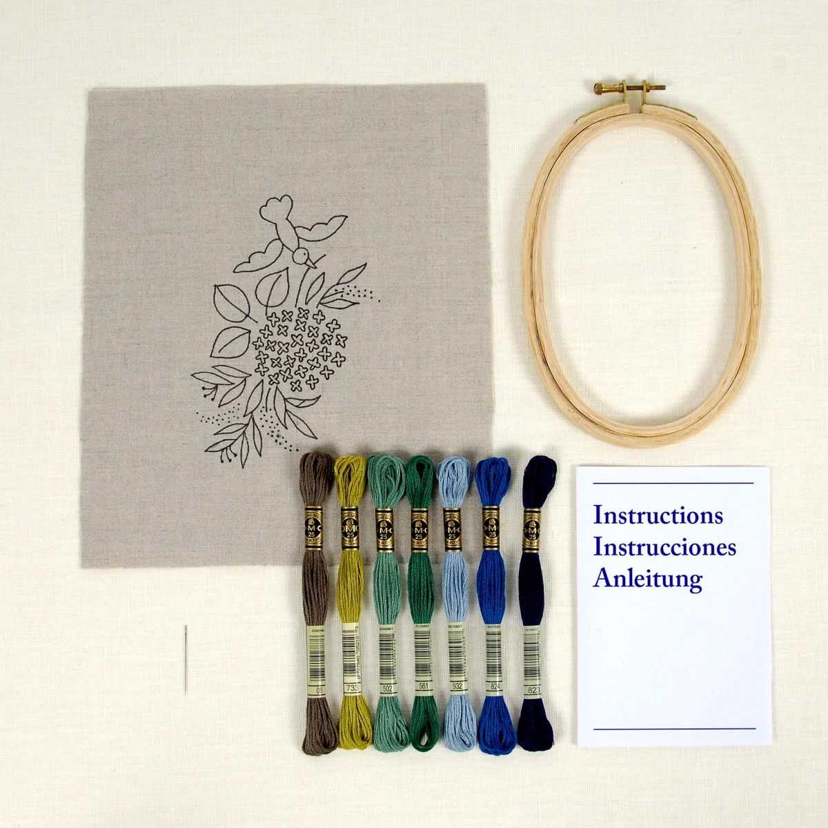 Kit de bordado completo, inclui linho impresso, bastidor, agulha, meadas DMC e instruções