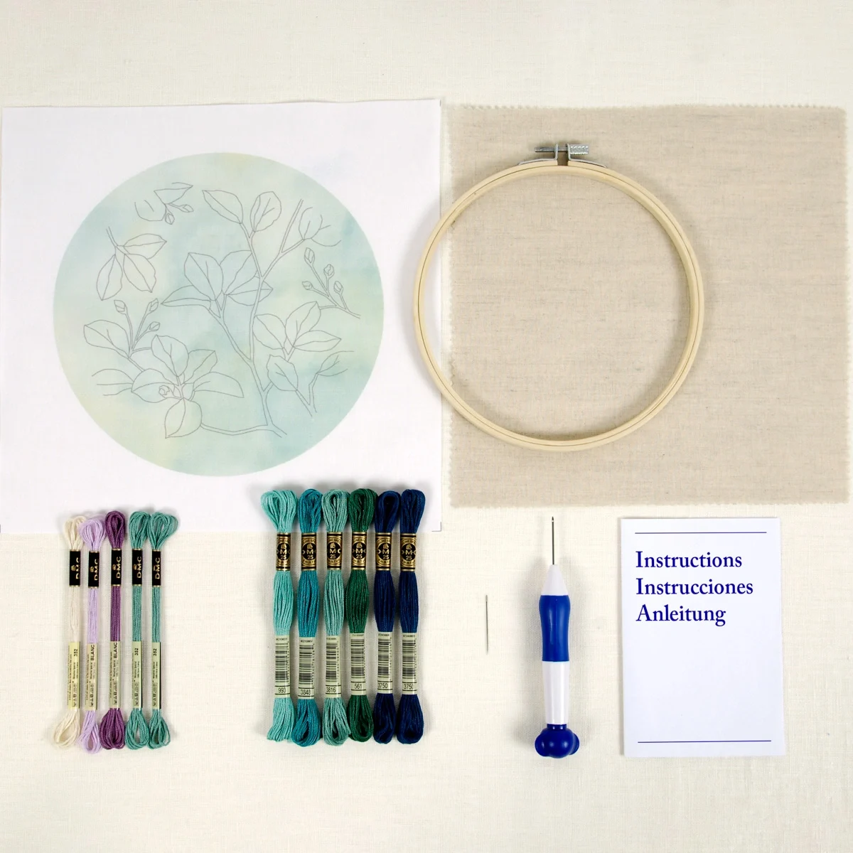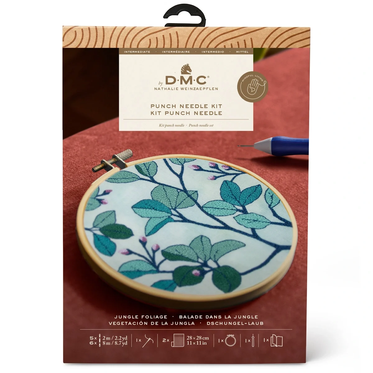 Uma composição contemporânea de folhas e botões em tons suaves de verdes naturais. Os desenhos de Nathalie Weinzaepflen, inspirados por viagens e paisagens subaquáticas, ganham vida neste kit. Inclui uma agulha punch needle fina, ideal para fios delicados, e tecido pré-impresso com o motivo, para começares a bordar de imediato.