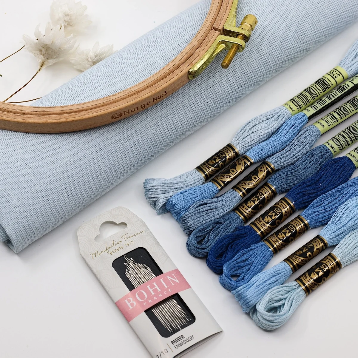 Um recorte de linho numa cor que entra em perfeita sintonia com o conjunto de 8 meadas DMC Mouliné Spécial;