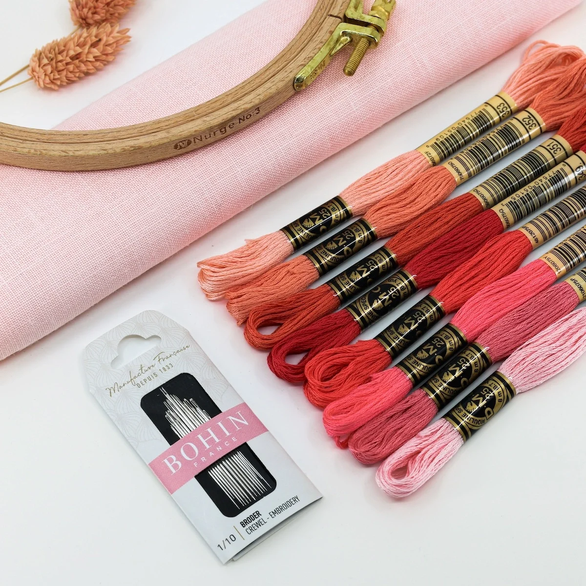 Um recorte de linho numa cor que entra em perfeita sintonia com o conjunto de 8 meadas DMC Mouliné Spécial;