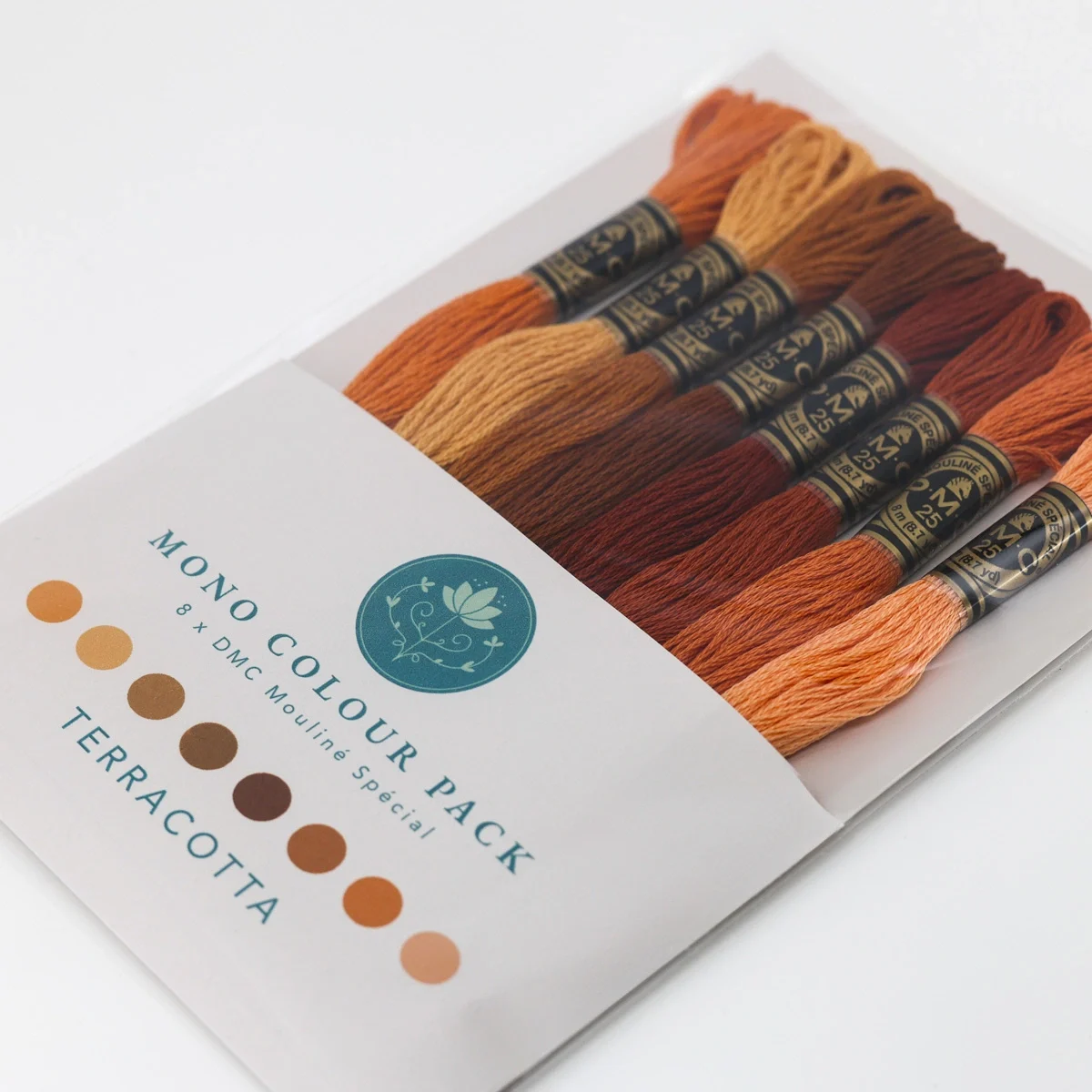 Este Mono Colour Pack foi criado para ti: uma combinação subtil e elegante de 8 meadas DMC Mouliné Spécial, todas dentro do mesmo matiz, com variações tonais que criam profundidade e harmonia no teu bordado.