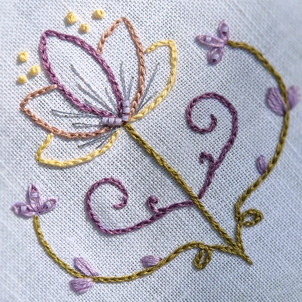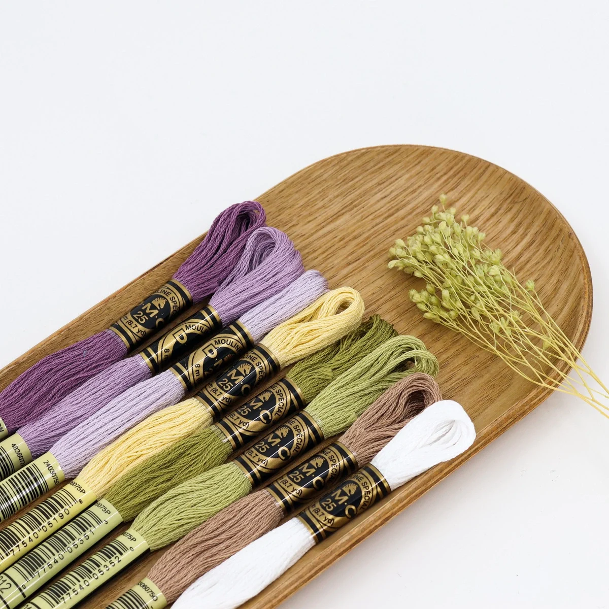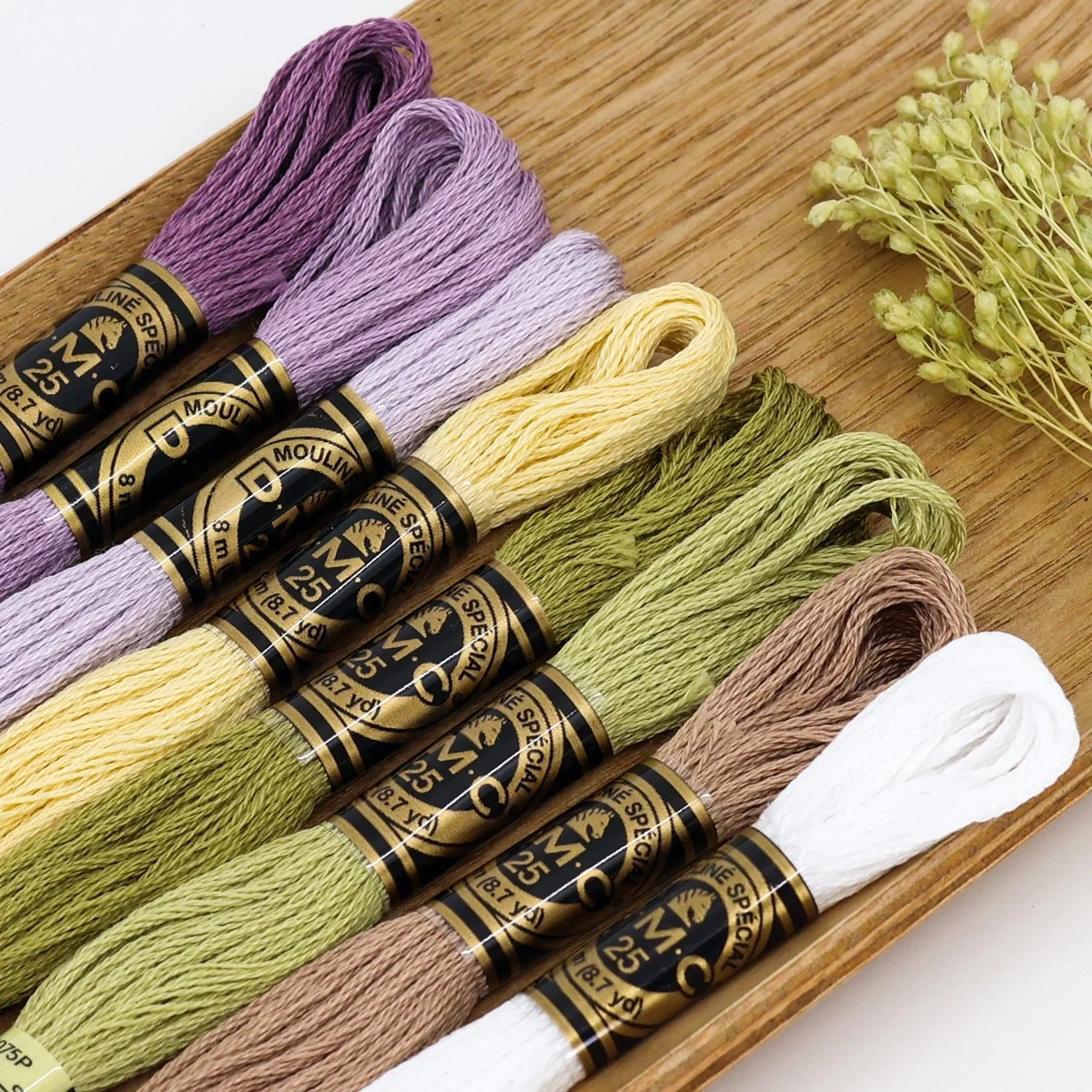 Uma paleta suave e botânica que combina lilases delicados, amarelos claros, verdes secos e neutros quentes – perfeita para bordados naturais e cheios de serenidade.