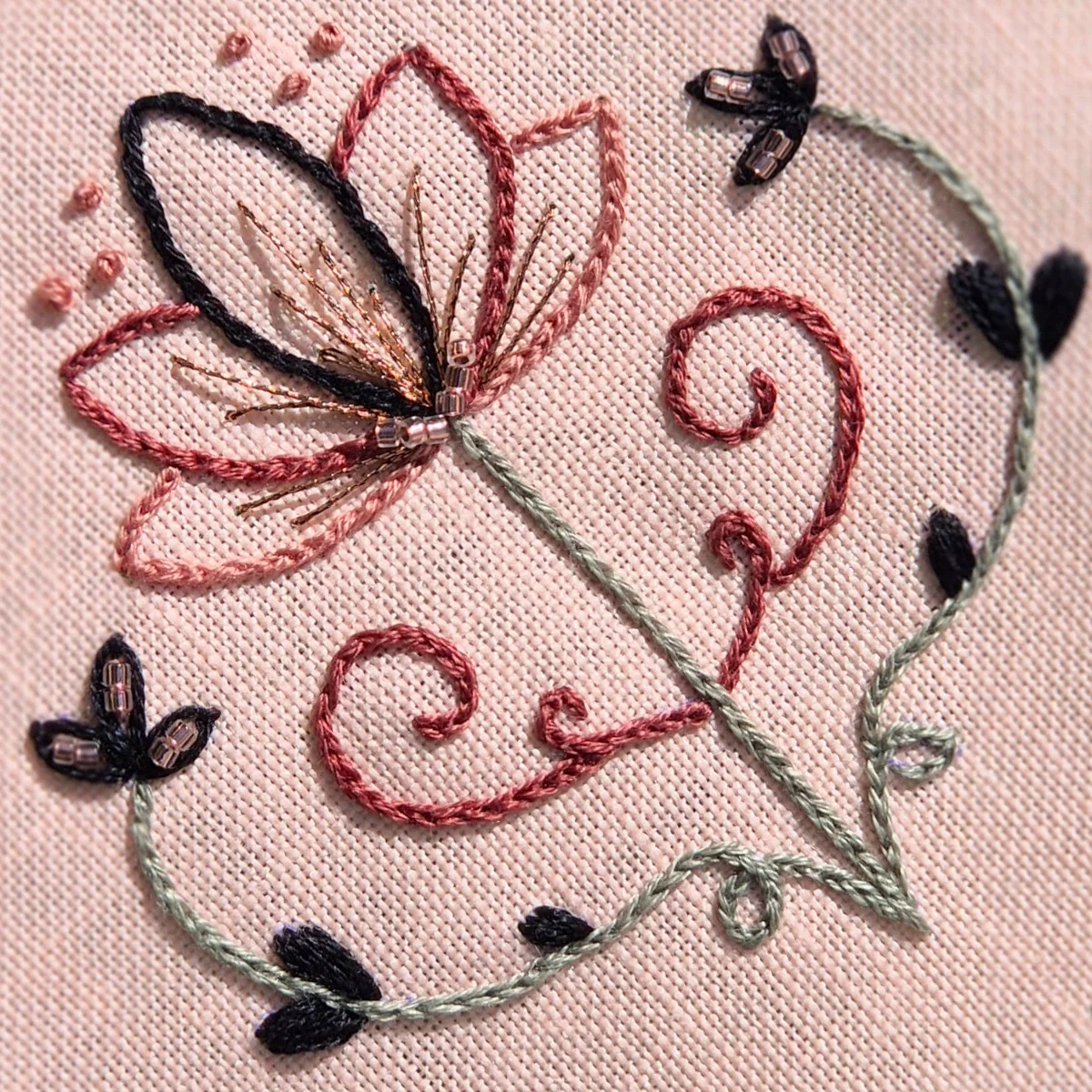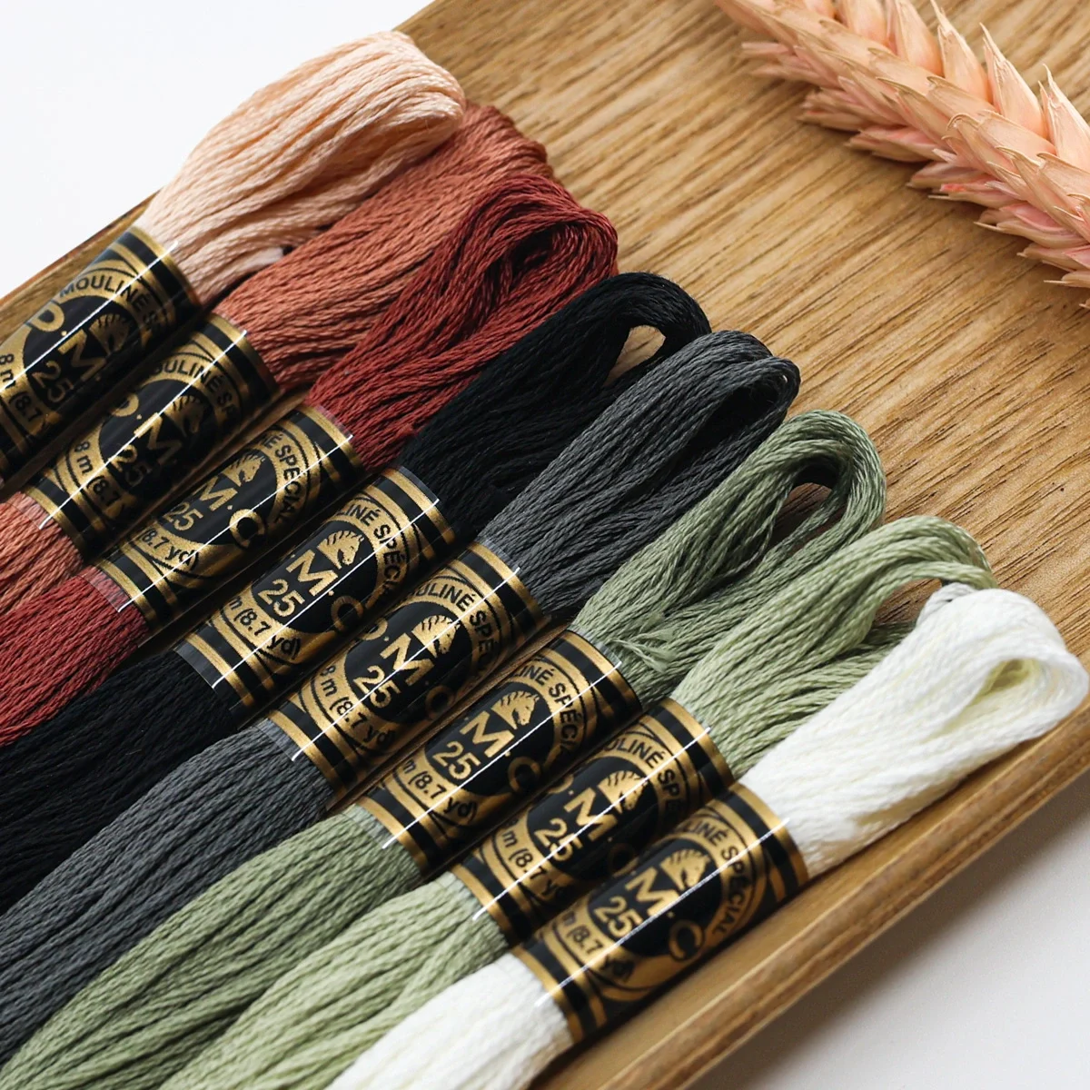 Uma paleta intensa e elegante que combina tons pêssego terrosos, pretos e cinzas profundos, com verdes secos suaves – ideal para bordados modernos, contrastantes e cheios de caráter.