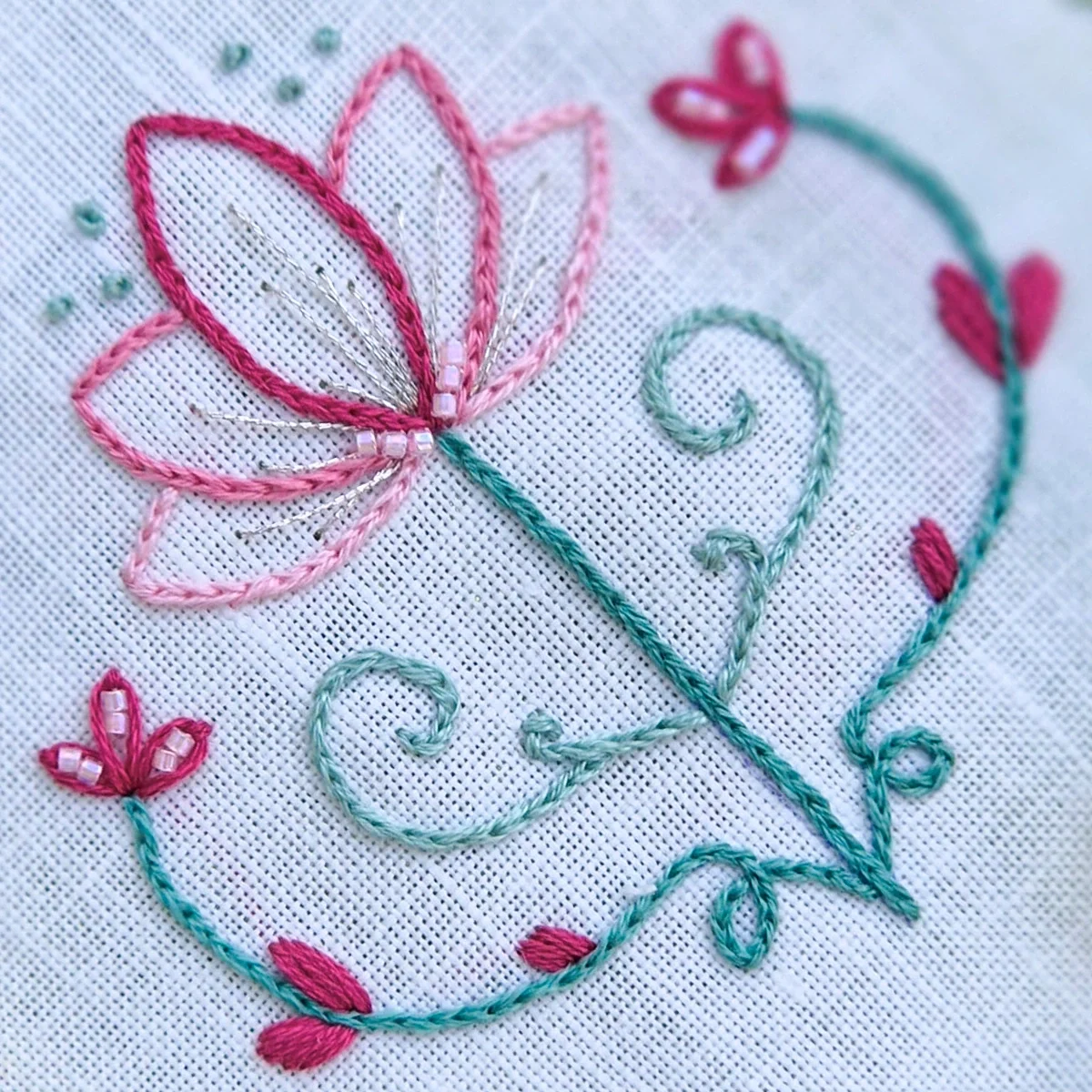 Uma paleta fresca e delicada que combina verdes suaves, rosas vivos e branco puro — perfeita para bordados florais, românticos e cheios de luminosidade.