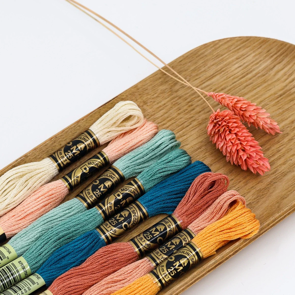 Esta é uma paleta fresca e luminosa que junta cremes suaves, pêssegos delicados, verdes água e um azul turquesa — ideal para bordados serenos, modernos e cheios de leveza.