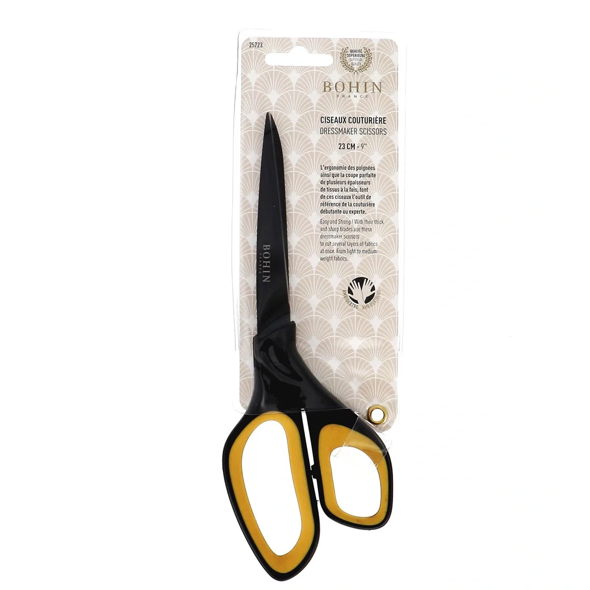 Tesoura de costura Bohin com lâminas de aço inoxidável (23 cm) e pegas soft touch. Corte limpo, conforto garantido.